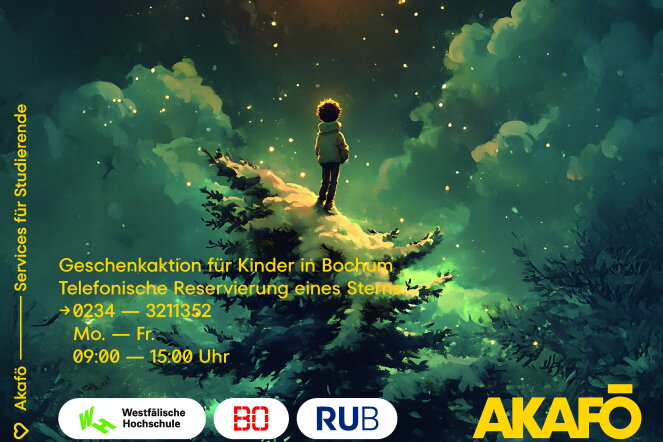 Auch in diesem Jahr veranstaltet das AKAFÖ gemeinsam mit mehreren Hochschulen die Wunschbaum-Aktion. Vom 3. bis 16. Dezember können freiwillige Helfer:innen Geschenkwünschevon Kindern erfüllen und diese – festlich verpackt – an einer der insgesamt fünf Sammelstellen in Bochum, Gelsenkirchen, Bocholt und Recklinghausen abgeben.